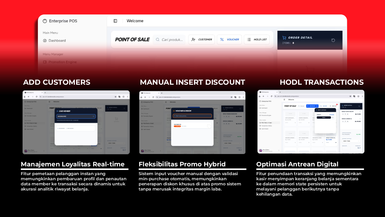 Evolusi sistem kasir enterprise dengan manajemen antrean (Transaction Hold), fleksibilitas voucher manual, dan pemetaan pelanggan real-time untuk akurasi data bisnis yang tak tertandingi.